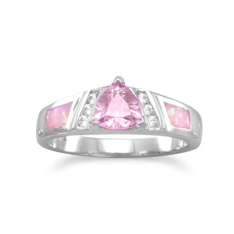 Sterling Silver, Trillion Shaped Pink CZ, Clear CZs,& Pink Opal Ring