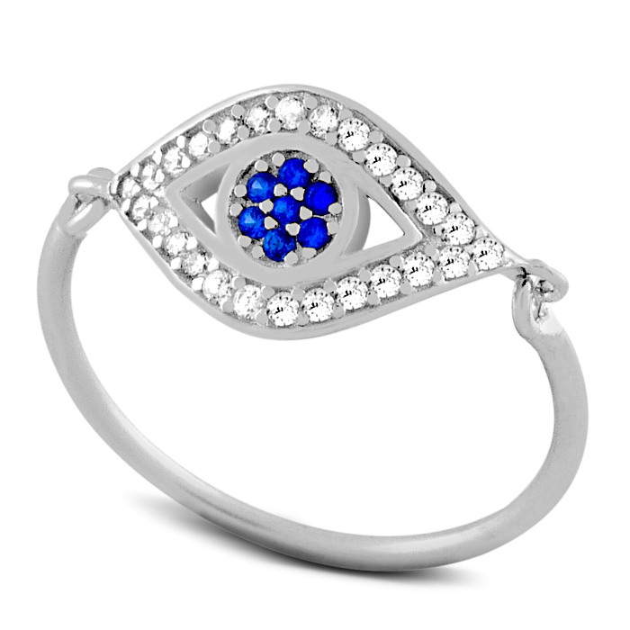Here it is! This 925 Sterling Silver evileye ring has clear round micro-pave Cubizc Zirconias and the iris of the eye is made from a stricking blue color CZS.