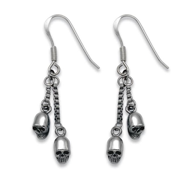 Double dangling 316L Stainless Steel skulls are suspended from thin box chains.