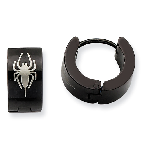 These PVD Black Stainless Steel huggie earrings have a shiny silver spider.